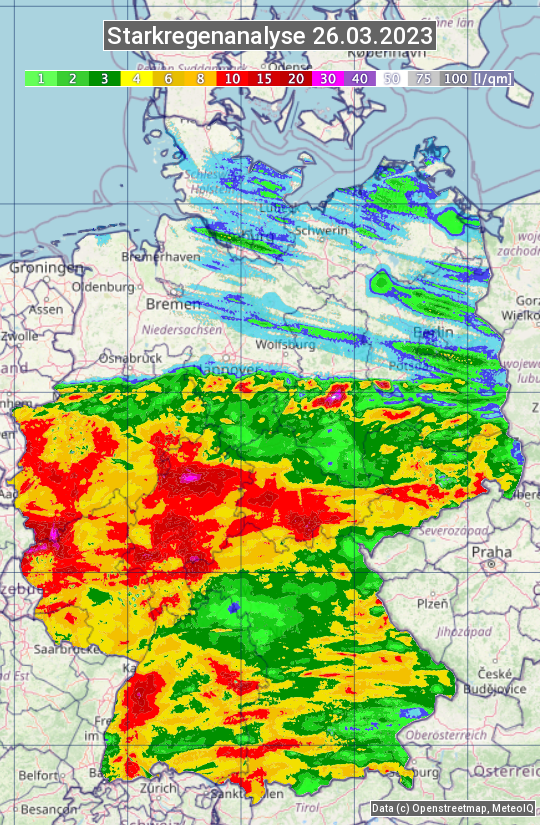 Die Starkregenanalyse zeigt die 24h-Niederschlagssumme am 26.03.2023. Sie basiert auf Radardaten vom Deutschen Wetterdienst in Kombination mit Wetterstationsbeobachtungen.