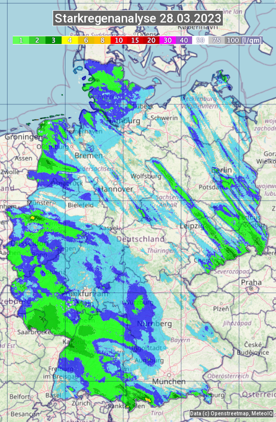 Die Starkregenanalyse zeigt die 24h-Niederschlagssumme am 28.03.2023. Sie basiert auf Radardaten vom Deutschen Wetterdienst in Kombination mit Wetterstationsbeobachtungen.