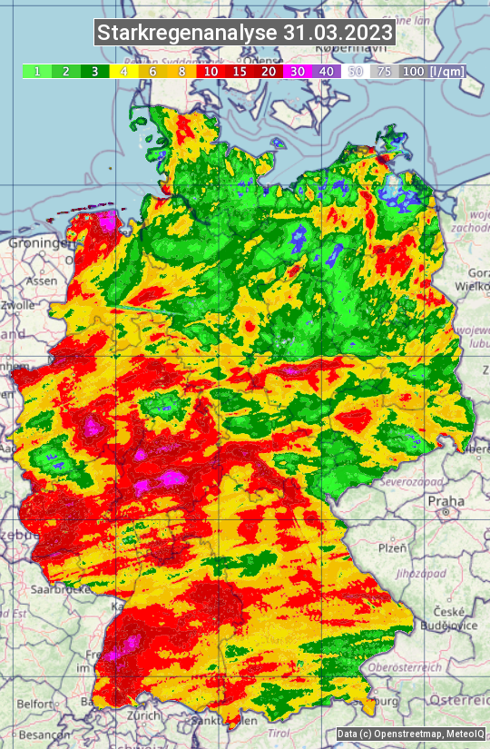 Die Starkregenanalyse zeigt die 24h-Niederschlagssumme am 31.03.2023. Sie basiert auf Radardaten vom Deutschen Wetterdienst in Kombination mit Wetterstationsbeobachtungen.