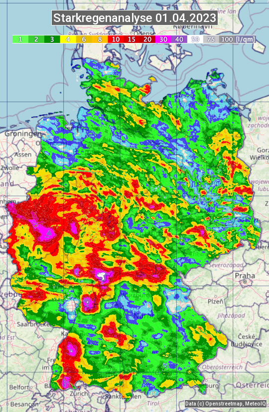 Die Starkregenanalyse zeigt die 24h-Niederschlagssumme am 01.04.2023. Sie basiert auf Radardaten vom Deutschen Wetterdienst in Kombination mit Wetterstationsbeobachtungen.