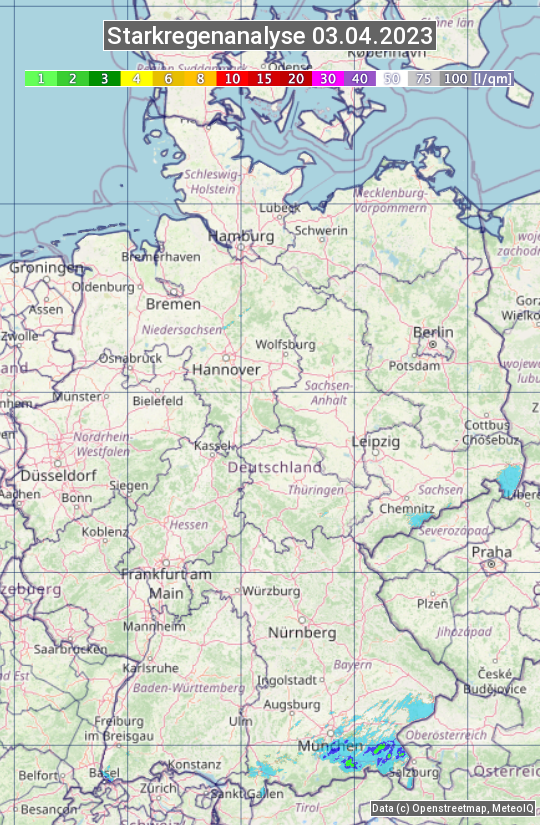 Die Starkregenanalyse zeigt die 24h-Niederschlagssumme am 03.04.2023. Sie basiert auf Radardaten vom Deutschen Wetterdienst in Kombination mit Wetterstationsbeobachtungen.
