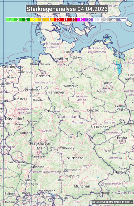 Die Starkregenanalyse zeigt die 24h-Niederschlagssumme am 04.04.2023. Sie basiert auf Radardaten vom Deutschen Wetterdienst in Kombination mit Wetterstationsbeobachtungen.