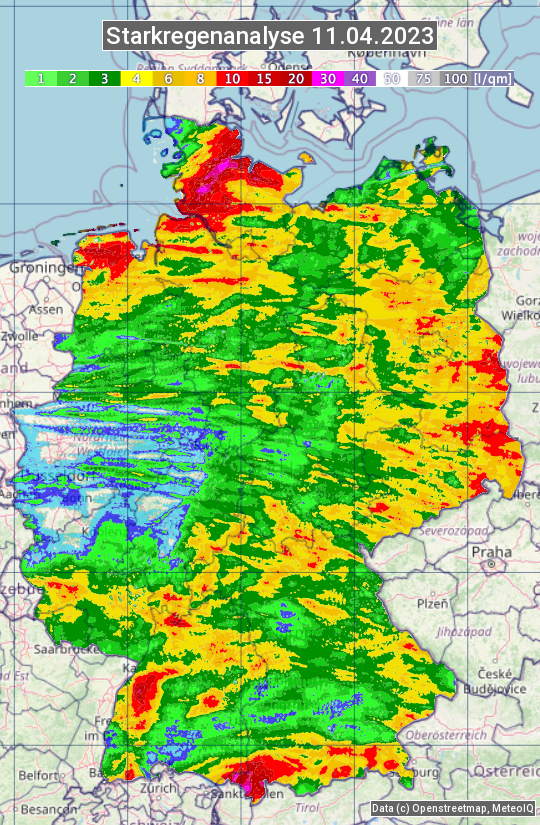 Die Starkregenanalyse zeigt die 24h-Niederschlagssumme am 11.04.2023. Sie basiert auf Radardaten vom Deutschen Wetterdienst in Kombination mit Wetterstationsbeobachtungen.