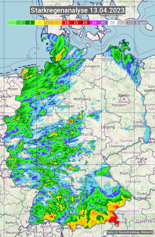 Die Starkregenanalyse zeigt die 24h-Niederschlagssumme am 13.04.2023. Sie basiert auf Radardaten vom Deutschen Wetterdienst in Kombination mit Wetterstationsbeobachtungen.