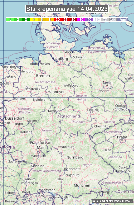 Die Starkregenanalyse zeigt die 24h-Niederschlagssumme am 14.04.2023. Sie basiert auf Radardaten vom Deutschen Wetterdienst in Kombination mit Wetterstationsbeobachtungen.