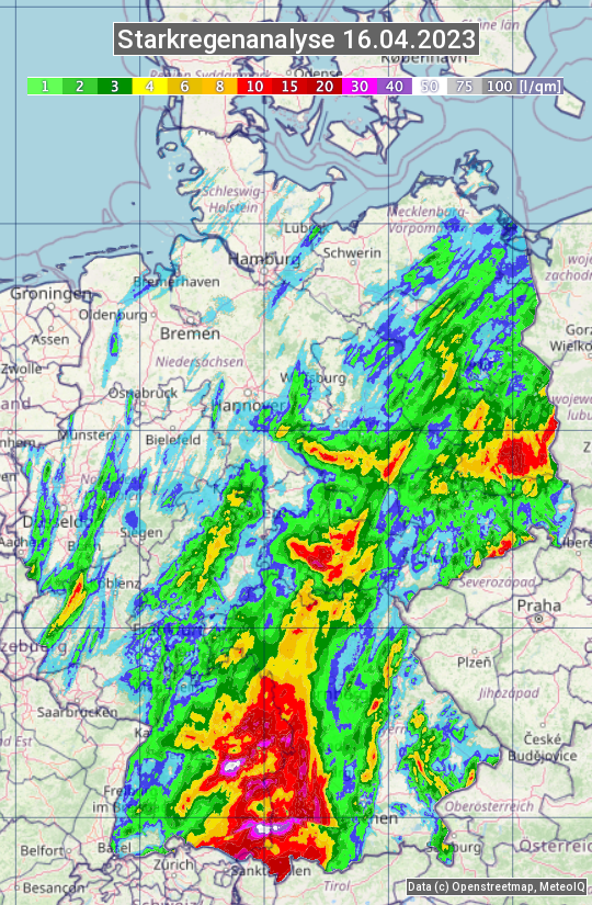 Die Starkregenanalyse zeigt die 24h-Niederschlagssumme am 16.04.2023. Sie basiert auf Radardaten vom Deutschen Wetterdienst in Kombination mit Wetterstationsbeobachtungen.