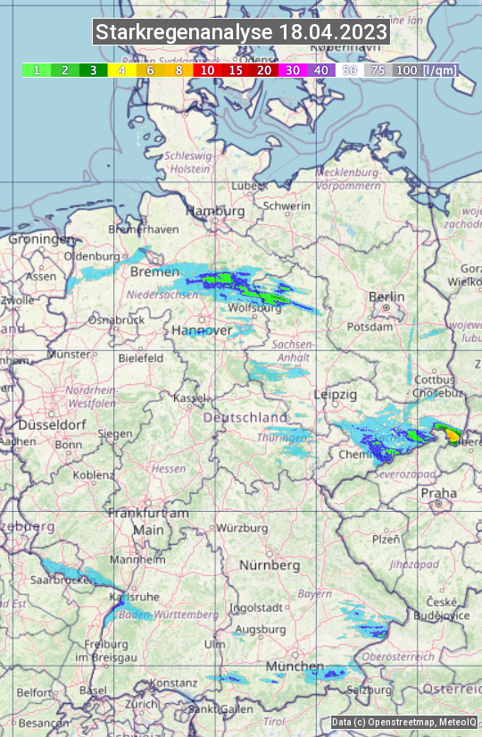 Die Starkregenanalyse zeigt die 24h-Niederschlagssumme am 18.04.2023. Sie basiert auf Radardaten vom Deutschen Wetterdienst in Kombination mit Wetterstationsbeobachtungen.