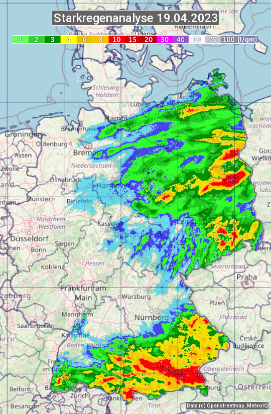 Die Starkregenanalyse zeigt die 24h-Niederschlagssumme am 19.04.2023. Sie basiert auf Radardaten vom Deutschen Wetterdienst in Kombination mit Wetterstationsbeobachtungen.