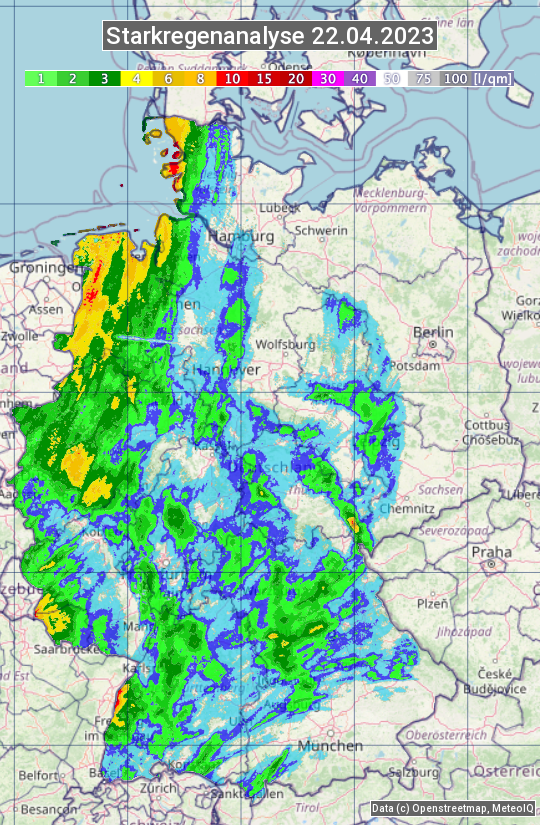 Die Starkregenanalyse zeigt die 24h-Niederschlagssumme am 22.04.2023. Sie basiert auf Radardaten vom Deutschen Wetterdienst in Kombination mit Wetterstationsbeobachtungen.