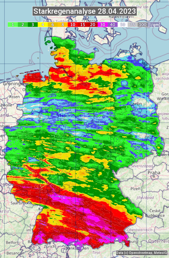 Die Starkregenanalyse zeigt die 24h-Niederschlagssumme am 28.04.2023. Sie basiert auf Radardaten vom Deutschen Wetterdienst in Kombination mit Wetterstationsbeobachtungen.