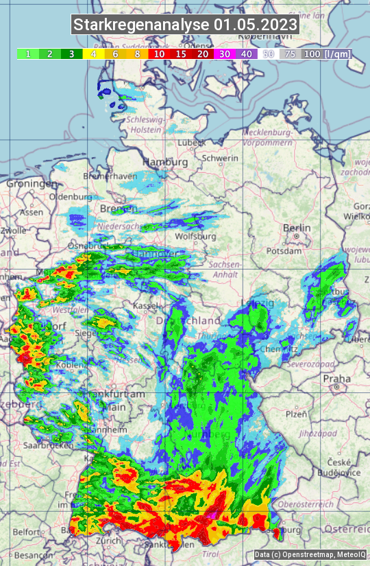 Die Starkregenanalyse zeigt die 24h-Niederschlagssumme am 01.05.2023. Sie basiert auf Radardaten vom Deutschen Wetterdienst in Kombination mit Wetterstationsbeobachtungen.
