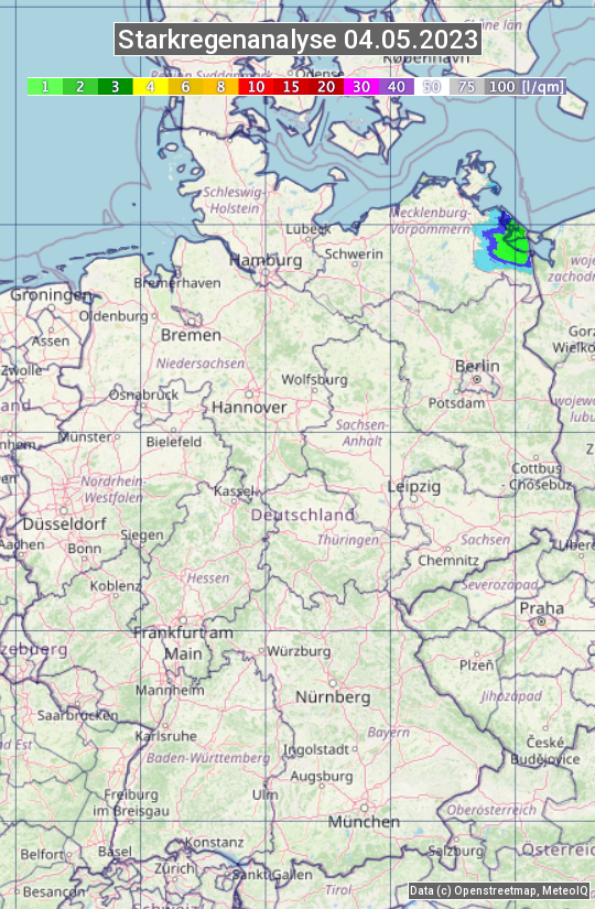 Die Starkregenanalyse zeigt die 24h-Niederschlagssumme am 04.05.2023. Sie basiert auf Radardaten vom Deutschen Wetterdienst in Kombination mit Wetterstationsbeobachtungen.