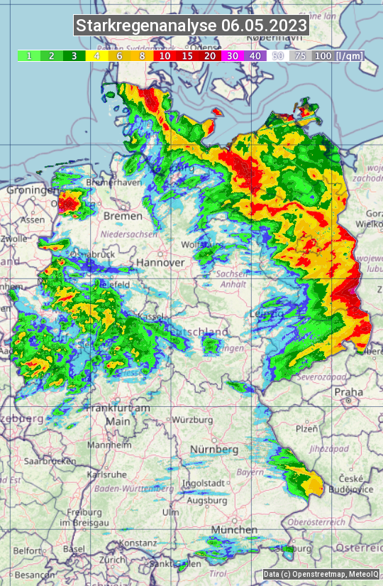 Die Starkregenanalyse zeigt die 24h-Niederschlagssumme am 06.05.2023. Sie basiert auf Radardaten vom Deutschen Wetterdienst in Kombination mit Wetterstationsbeobachtungen.