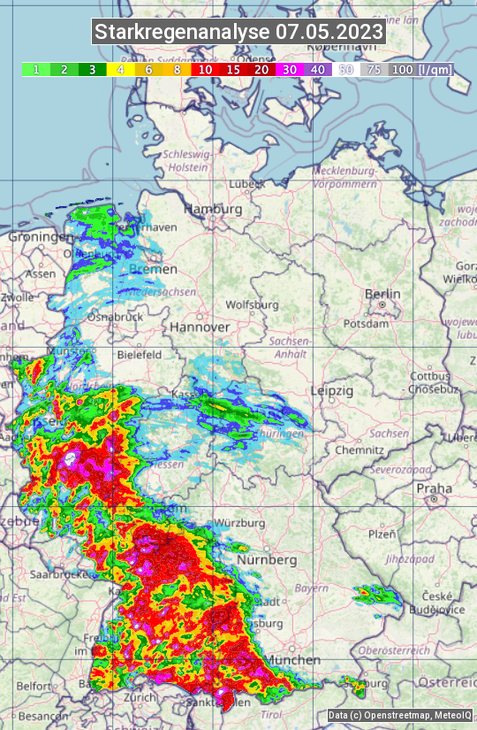 Die Starkregenanalyse zeigt die 24h-Niederschlagssumme am 07.05.2023. Sie basiert auf Radardaten vom Deutschen Wetterdienst in Kombination mit Wetterstationsbeobachtungen.
