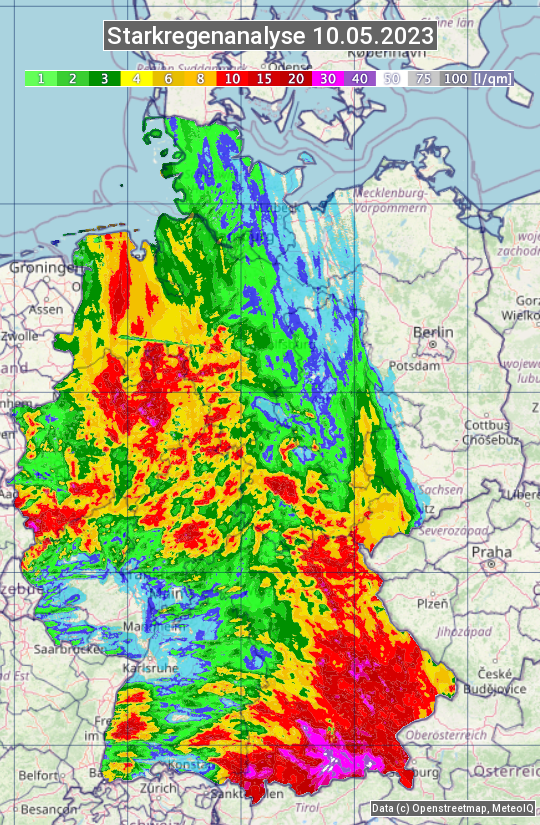 Die Starkregenanalyse zeigt die 24h-Niederschlagssumme am 10.05.2023. Sie basiert auf Radardaten vom Deutschen Wetterdienst in Kombination mit Wetterstationsbeobachtungen.