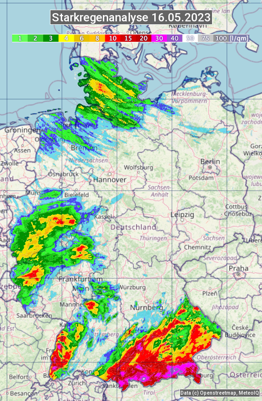 Die Starkregenanalyse zeigt die 24h-Niederschlagssumme am 16.05.2023. Sie basiert auf Radardaten vom Deutschen Wetterdienst in Kombination mit Wetterstationsbeobachtungen.