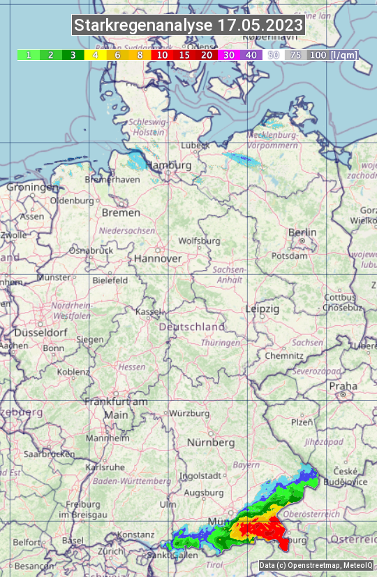 Die Starkregenanalyse zeigt die 24h-Niederschlagssumme am 17.05.2023. Sie basiert auf Radardaten vom Deutschen Wetterdienst in Kombination mit Wetterstationsbeobachtungen.