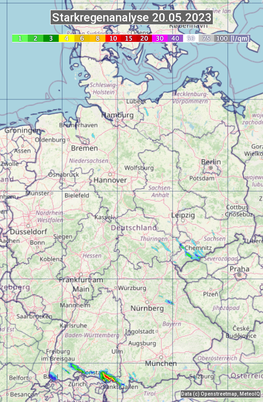 Die Starkregenanalyse zeigt die 24h-Niederschlagssumme am 20.05.2023. Sie basiert auf Radardaten vom Deutschen Wetterdienst in Kombination mit Wetterstationsbeobachtungen.