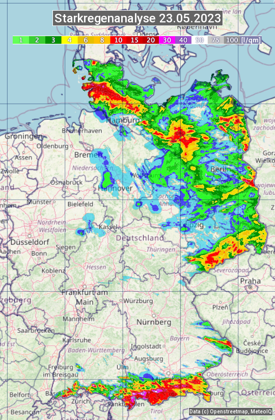 Die Starkregenanalyse zeigt die 24h-Niederschlagssumme am 23.05.2023. Sie basiert auf Radardaten vom Deutschen Wetterdienst in Kombination mit Wetterstationsbeobachtungen.