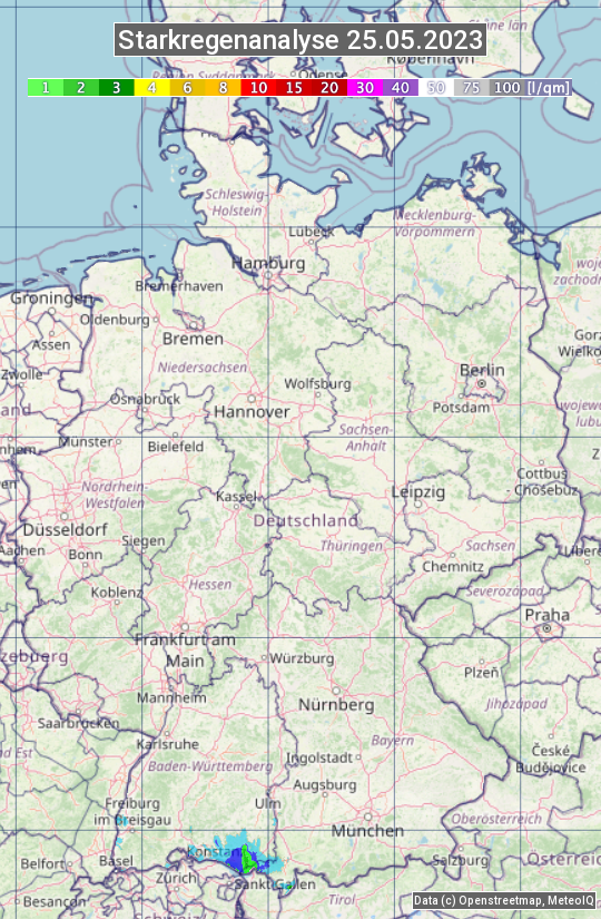 Die Starkregenanalyse zeigt die 24h-Niederschlagssumme am 25.05.2023. Sie basiert auf Radardaten vom Deutschen Wetterdienst in Kombination mit Wetterstationsbeobachtungen.