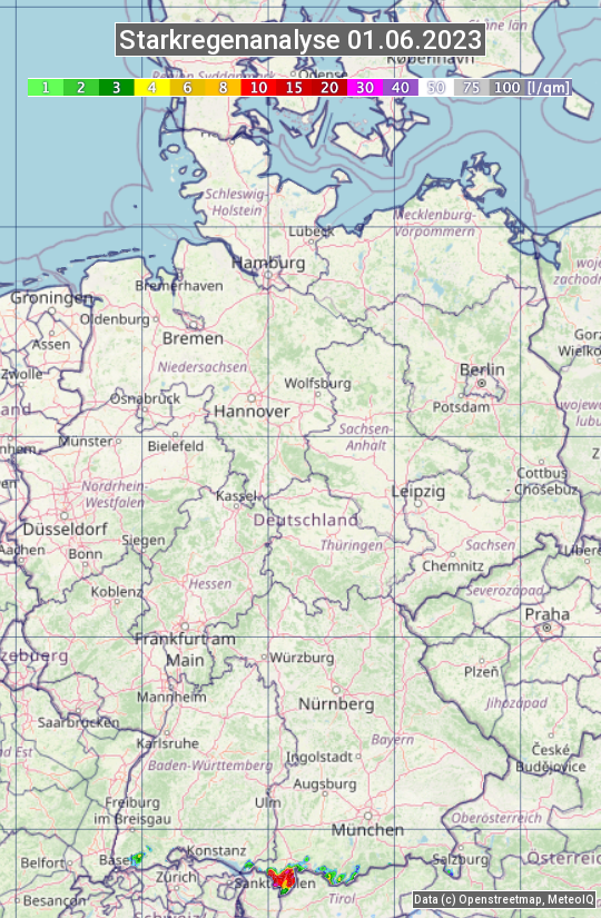 Die Starkregenanalyse zeigt die 24h-Niederschlagssumme am 01.06.2023. Sie basiert auf Radardaten vom Deutschen Wetterdienst in Kombination mit Wetterstationsbeobachtungen.