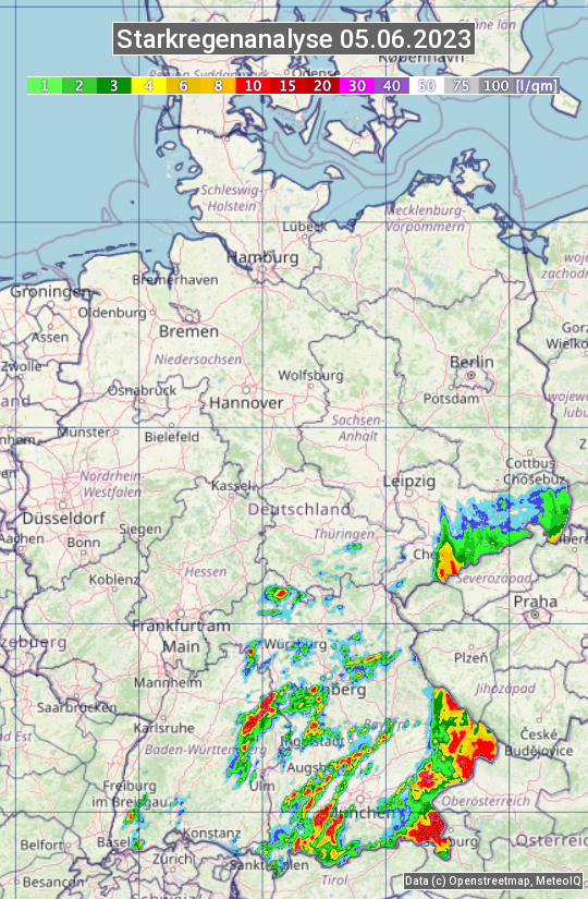 Die Starkregenanalyse zeigt die 24h-Niederschlagssumme am 05.06.2023. Sie basiert auf Radardaten vom Deutschen Wetterdienst in Kombination mit Wetterstationsbeobachtungen.