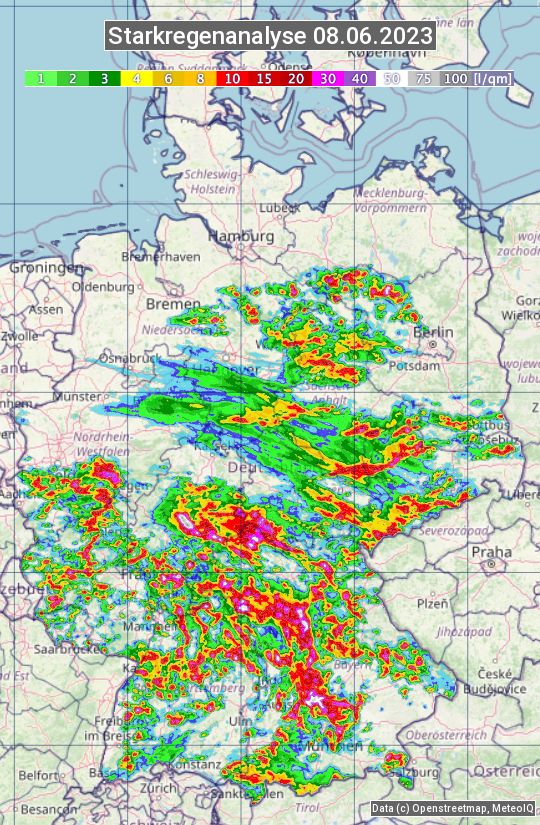 Die Starkregenanalyse zeigt die 24h-Niederschlagssumme am 08.06.2023. Sie basiert auf Radardaten vom Deutschen Wetterdienst in Kombination mit Wetterstationsbeobachtungen.