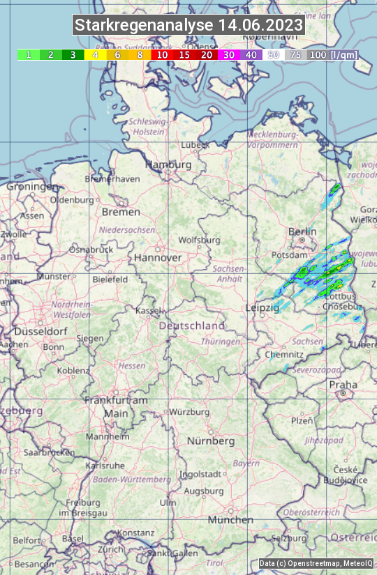 Die Starkregenanalyse zeigt die 24h-Niederschlagssumme am 14.06.2023. Sie basiert auf Radardaten vom Deutschen Wetterdienst in Kombination mit Wetterstationsbeobachtungen.