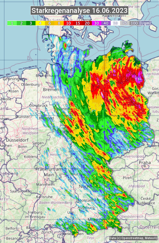 Die Starkregenanalyse zeigt die 24h-Niederschlagssumme am 16.06.2023. Sie basiert auf Radardaten vom Deutschen Wetterdienst in Kombination mit Wetterstationsbeobachtungen.