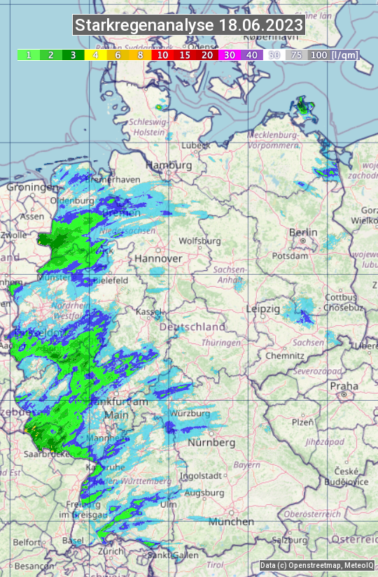 Die Starkregenanalyse zeigt die 24h-Niederschlagssumme am 18.06.2023. Sie basiert auf Radardaten vom Deutschen Wetterdienst in Kombination mit Wetterstationsbeobachtungen.