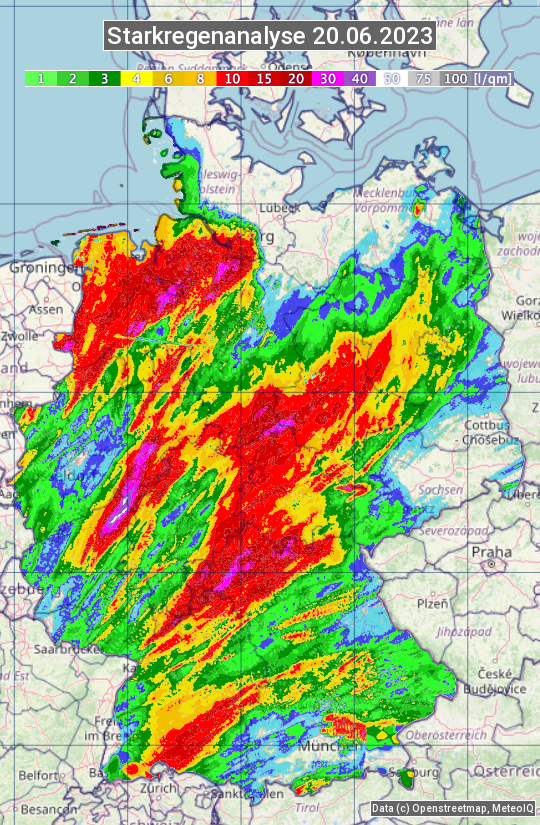 Die Starkregenanalyse zeigt die 24h-Niederschlagssumme am 20.06.2023. Sie basiert auf Radardaten vom Deutschen Wetterdienst in Kombination mit Wetterstationsbeobachtungen.