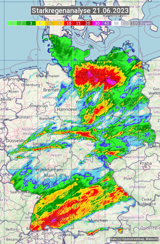 Die Starkregenanalyse zeigt die 24h-Niederschlagssumme am 21.06.2023. Sie basiert auf Radardaten vom Deutschen Wetterdienst in Kombination mit Wetterstationsbeobachtungen.