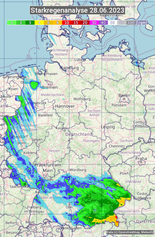 Die Starkregenanalyse zeigt die 24h-Niederschlagssumme am 28.06.2023. Sie basiert auf Radardaten vom Deutschen Wetterdienst in Kombination mit Wetterstationsbeobachtungen.