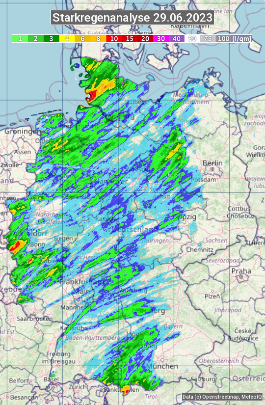 Die Starkregenanalyse zeigt die 24h-Niederschlagssumme am 29.06.2023. Sie basiert auf Radardaten vom Deutschen Wetterdienst in Kombination mit Wetterstationsbeobachtungen.