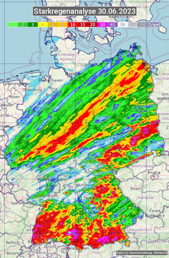 Die Starkregenanalyse zeigt die 24h-Niederschlagssumme am 30.06.2023. Sie basiert auf Radardaten vom Deutschen Wetterdienst in Kombination mit Wetterstationsbeobachtungen.