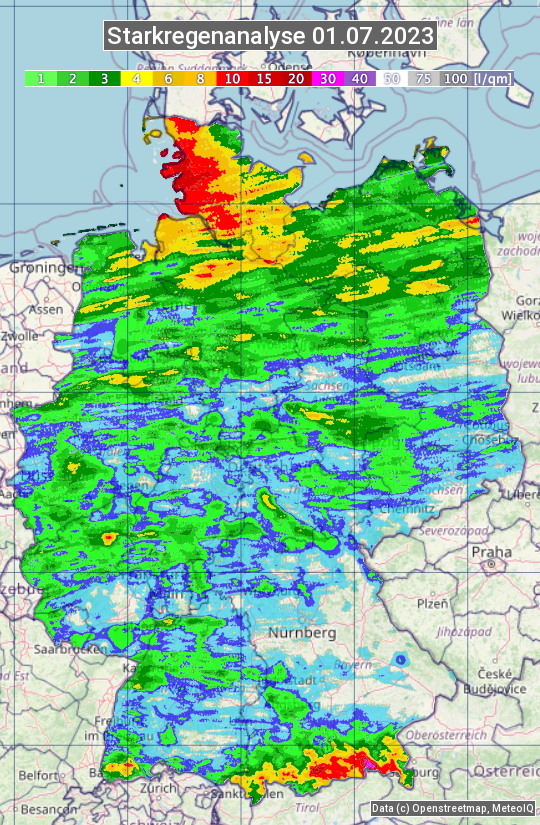 Die Starkregenanalyse zeigt die 24h-Niederschlagssumme am 01.07.2023. Sie basiert auf Radardaten vom Deutschen Wetterdienst in Kombination mit Wetterstationsbeobachtungen.
