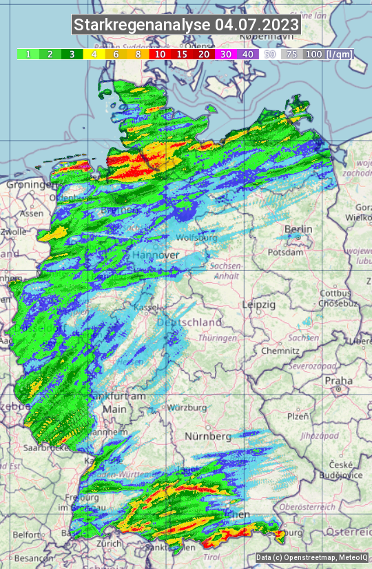 Die Starkregenanalyse zeigt die 24h-Niederschlagssumme am 04.07.2023. Sie basiert auf Radardaten vom Deutschen Wetterdienst in Kombination mit Wetterstationsbeobachtungen.
