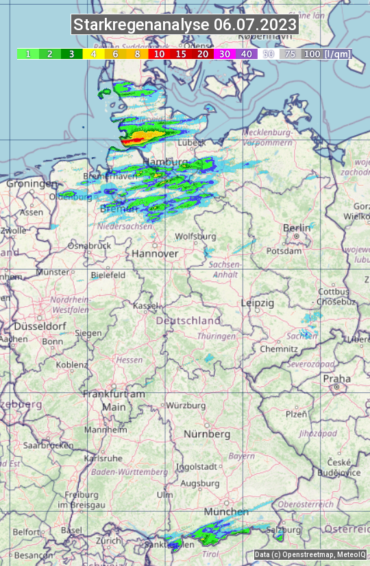 Die Starkregenanalyse zeigt die 24h-Niederschlagssumme am 06.07.2023. Sie basiert auf Radardaten vom Deutschen Wetterdienst in Kombination mit Wetterstationsbeobachtungen.