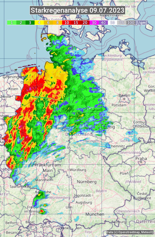Die Starkregenanalyse zeigt die 24h-Niederschlagssumme am 09.07.2023. Sie basiert auf Radardaten vom Deutschen Wetterdienst in Kombination mit Wetterstationsbeobachtungen.