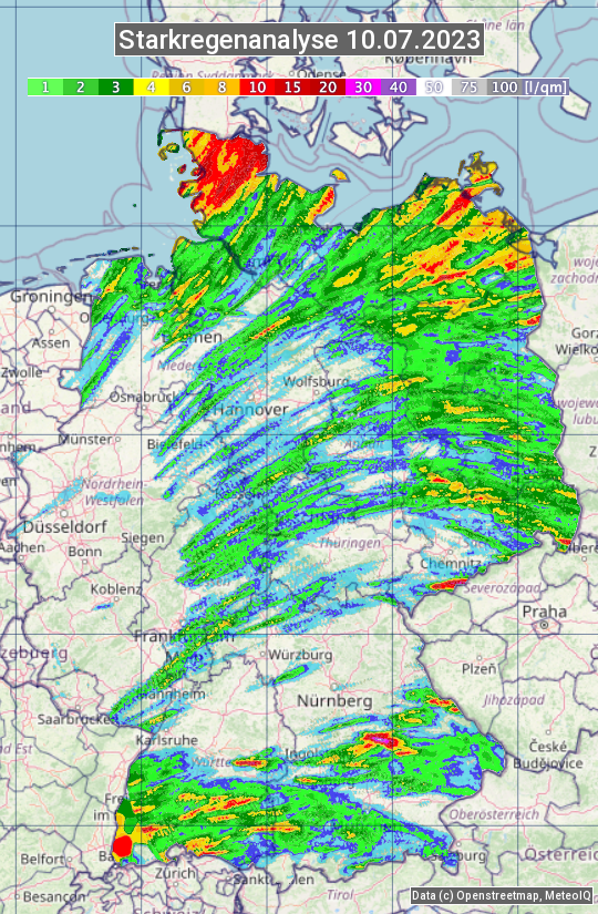 Die Starkregenanalyse zeigt die 24h-Niederschlagssumme am 10.07.2023. Sie basiert auf Radardaten vom Deutschen Wetterdienst in Kombination mit Wetterstationsbeobachtungen.