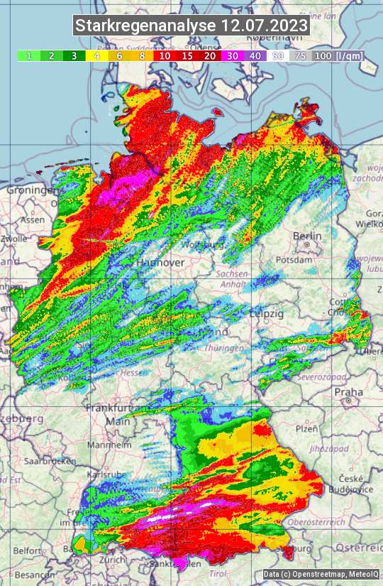 Die Starkregenanalyse zeigt die 24h-Niederschlagssumme am 12.07.2023. Sie basiert auf Radardaten vom Deutschen Wetterdienst in Kombination mit Wetterstationsbeobachtungen.
