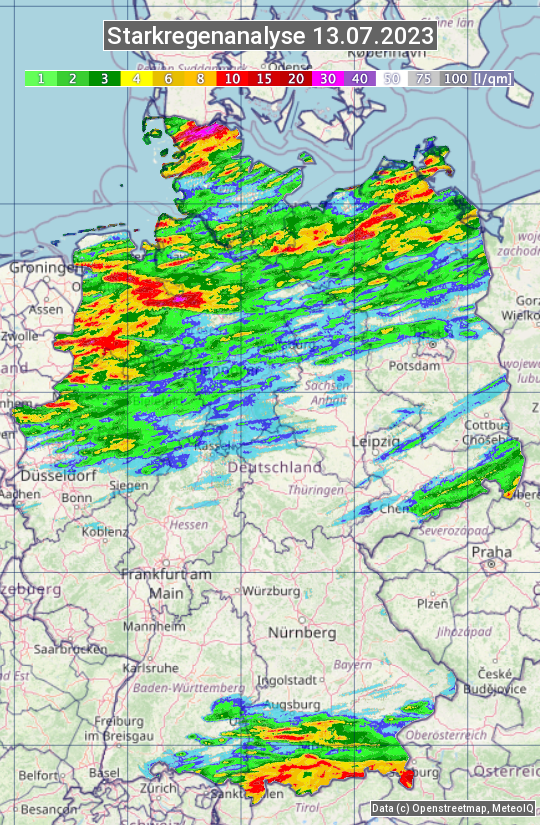 Die Starkregenanalyse zeigt die 24h-Niederschlagssumme am 13.07.2023. Sie basiert auf Radardaten vom Deutschen Wetterdienst in Kombination mit Wetterstationsbeobachtungen.
