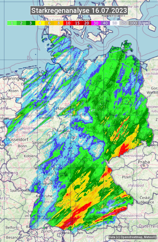 Die Starkregenanalyse zeigt die 24h-Niederschlagssumme am 16.07.2023. Sie basiert auf Radardaten vom Deutschen Wetterdienst in Kombination mit Wetterstationsbeobachtungen.