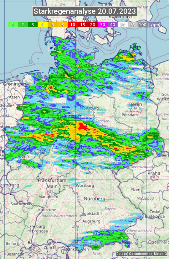 Die Starkregenanalyse zeigt die 24h-Niederschlagssumme am 20.07.2023. Sie basiert auf Radardaten vom Deutschen Wetterdienst in Kombination mit Wetterstationsbeobachtungen.