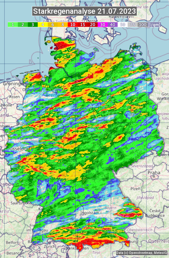 Die Starkregenanalyse zeigt die 24h-Niederschlagssumme am 21.07.2023. Sie basiert auf Radardaten vom Deutschen Wetterdienst in Kombination mit Wetterstationsbeobachtungen.