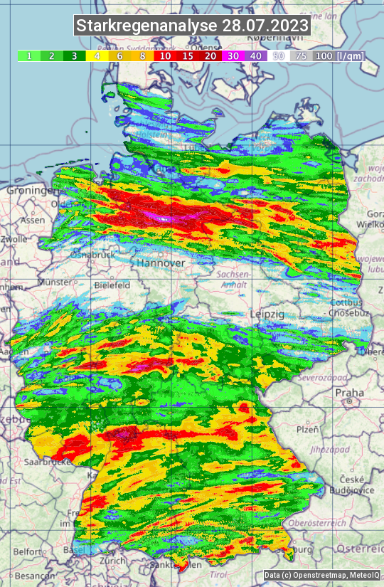 Die Starkregenanalyse zeigt die 24h-Niederschlagssumme am 28.07.2023. Sie basiert auf Radardaten vom Deutschen Wetterdienst in Kombination mit Wetterstationsbeobachtungen.
