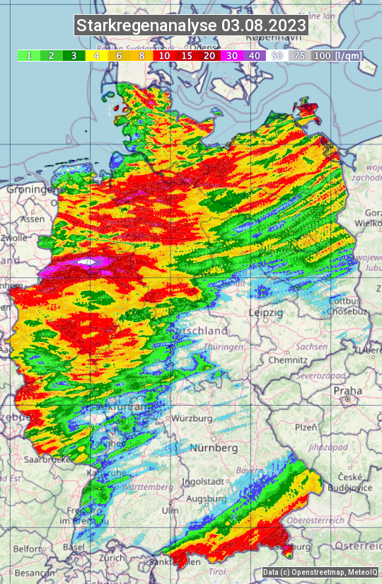 Die Starkregenanalyse zeigt die 24h-Niederschlagssumme am 03.08.2023. Sie basiert auf Radardaten vom Deutschen Wetterdienst in Kombination mit Wetterstationsbeobachtungen.