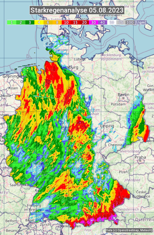 Die Starkregenanalyse zeigt die 24h-Niederschlagssumme am 05.08.2023. Sie basiert auf Radardaten vom Deutschen Wetterdienst in Kombination mit Wetterstationsbeobachtungen.