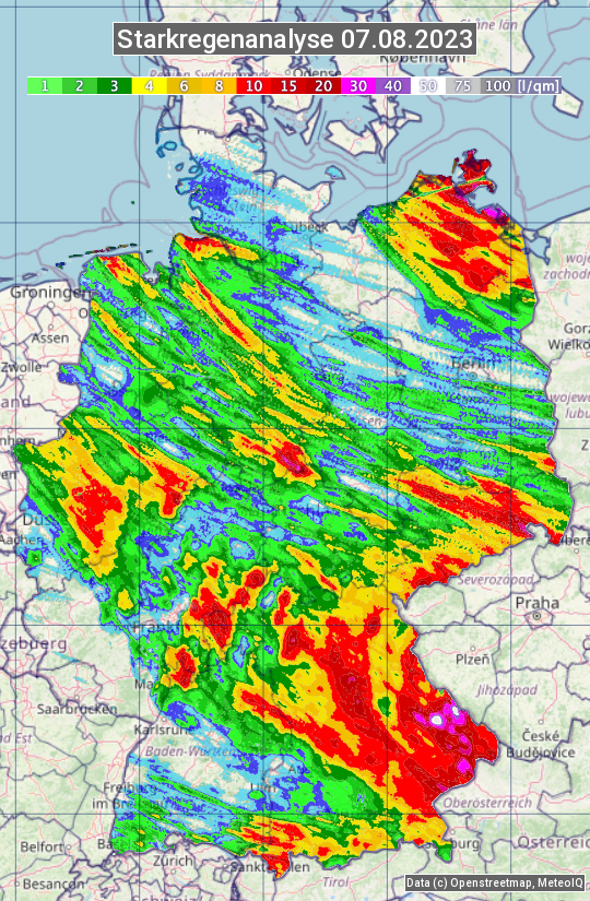Die Starkregenanalyse zeigt die 24h-Niederschlagssumme am 07.08.2023. Sie basiert auf Radardaten vom Deutschen Wetterdienst in Kombination mit Wetterstationsbeobachtungen.