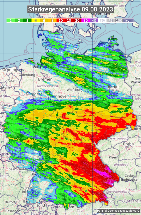 Die Starkregenanalyse zeigt die 24h-Niederschlagssumme am 09.08.2023. Sie basiert auf Radardaten vom Deutschen Wetterdienst in Kombination mit Wetterstationsbeobachtungen.